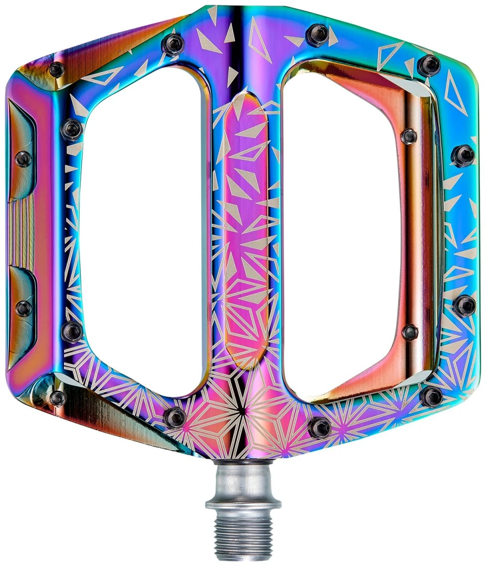 Get ready to fly high with the Krypto DH pedals. Built tough with its CNC’d aluminum body and self-lubricating bushings, this pedal makes a big statement on the trail with full laser graphics and premium finish. Ten strategically placed pins keep you in maximum control.